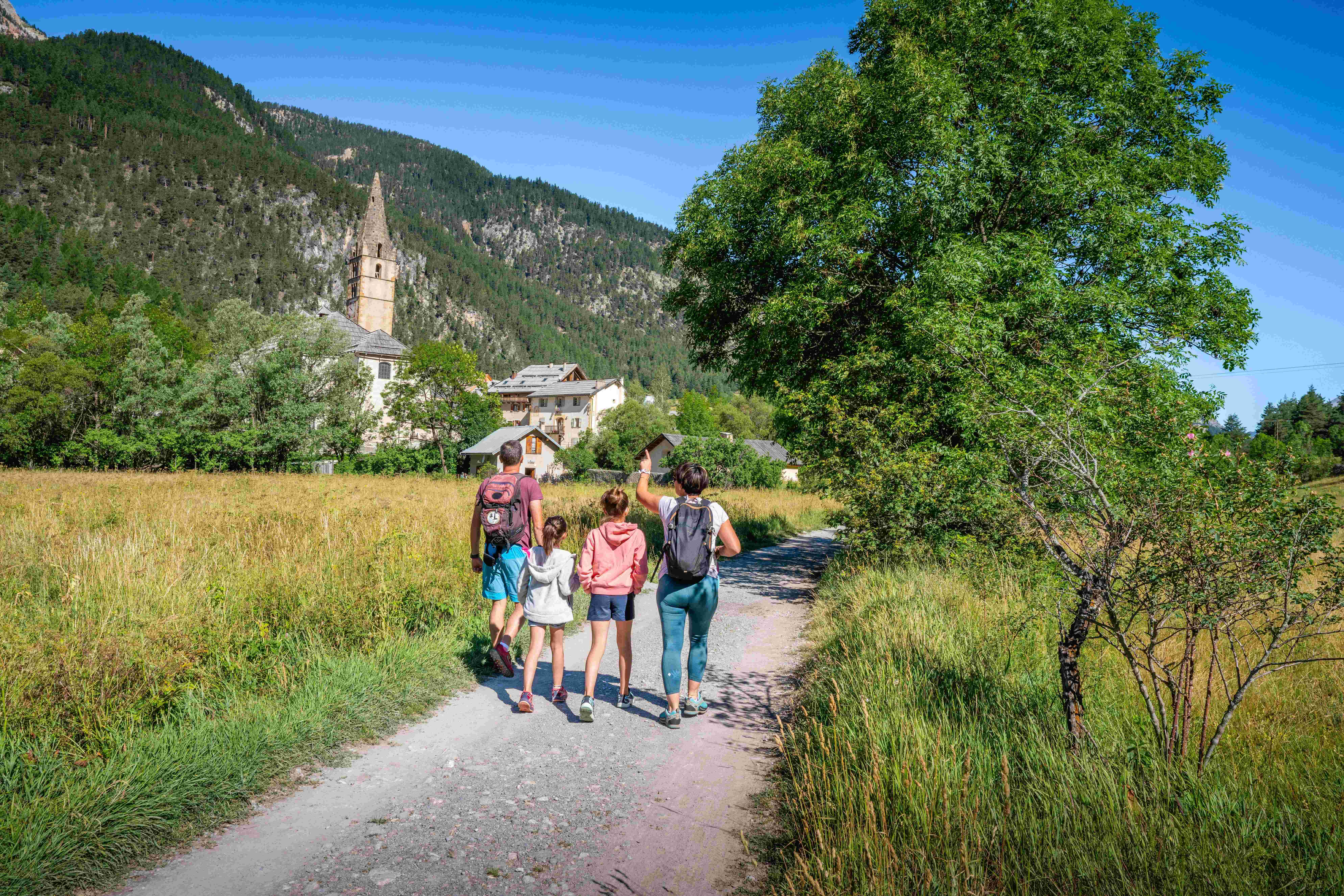 Depuis le parking du Rosier situé face au camping Huttopia, traversez le pont pour rejoindre la rive gauche de la rivière, puis engagez vous sur la large piste à gauche du pont. Celle-ci longe la Clarée sur environ 1km pour rejoindre Val-des-Prés et la belle église Saint-Claude que l'on distingue au loin.